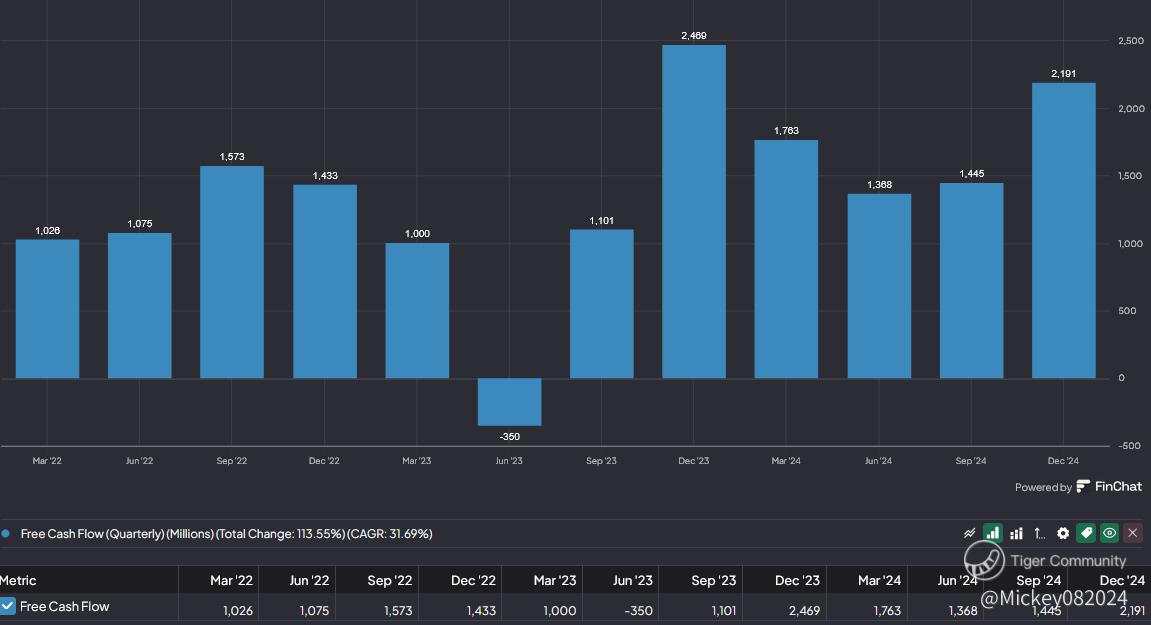 If we take the projected $6.5 billion in free cash flow and subtract $1.2 billion in stock-based compensation, we get a net figure of $5.3 billion. This results in a market cap multiple of 13. Based on this, we currently see about $5.2 per share in cash flow after accounting for stock-based compensation.