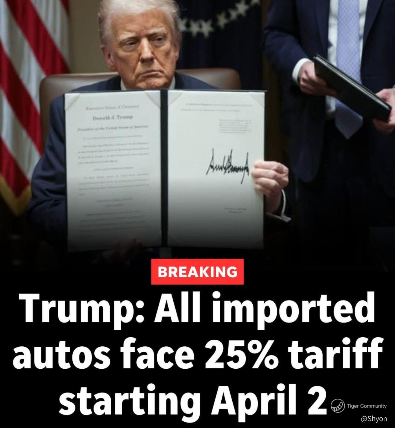 1. President Donald Trump signed an official proclamation imposing a 25% tariff on auto imports, escalating the trade war to encourage US manufacturing and potentially paving the way for further tariff expansions next week.