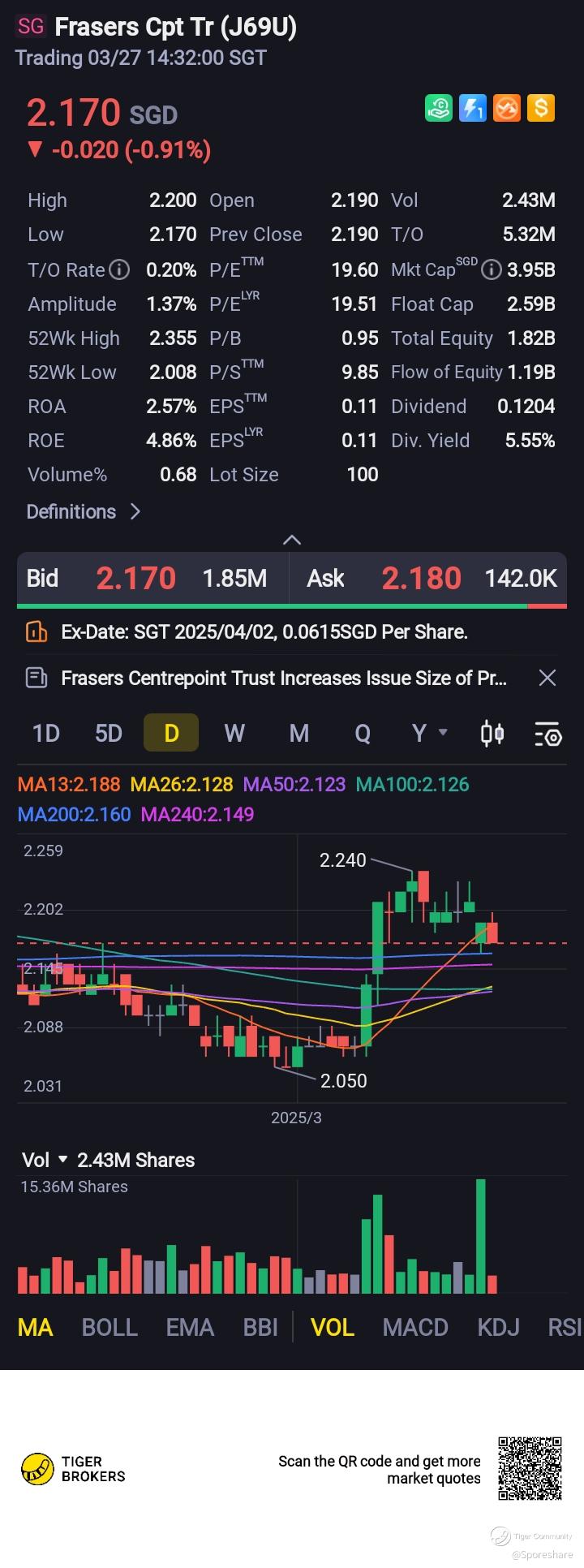 Frasers Cpt Tr - New acquisition of North Point City South Wing at 1.17b. PP price at 2.07. I think TERP ia about 2.13!