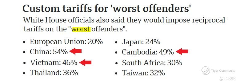 In a “surprise” turn of event, Trump did not further levy additional reciprocal tax on Mexico and Canada, unlike China that is (now) slapped with the highest tariff rate of 54%. (see above)