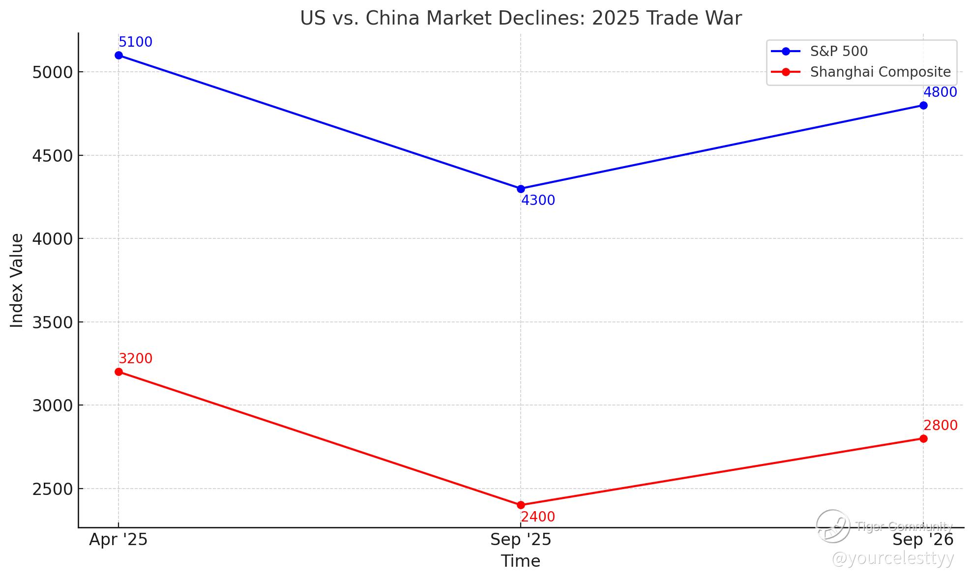 Data Point: In 2018-2019, China’s market fell 4x harder than the US’s. This time, with higher stakes, expect a similar gap—Shanghai Composite down 20-30% vs. S&P 500 down 10-15%.
