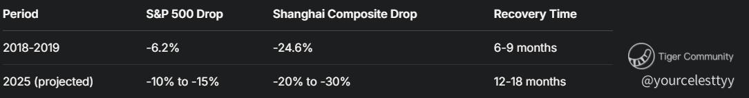 2018-2019 Clash: The S&P 500 fell 6.2% peak-to-trough; the Shanghai Composite cratered 24.6%. Recovery took 6-9 months after a truce.