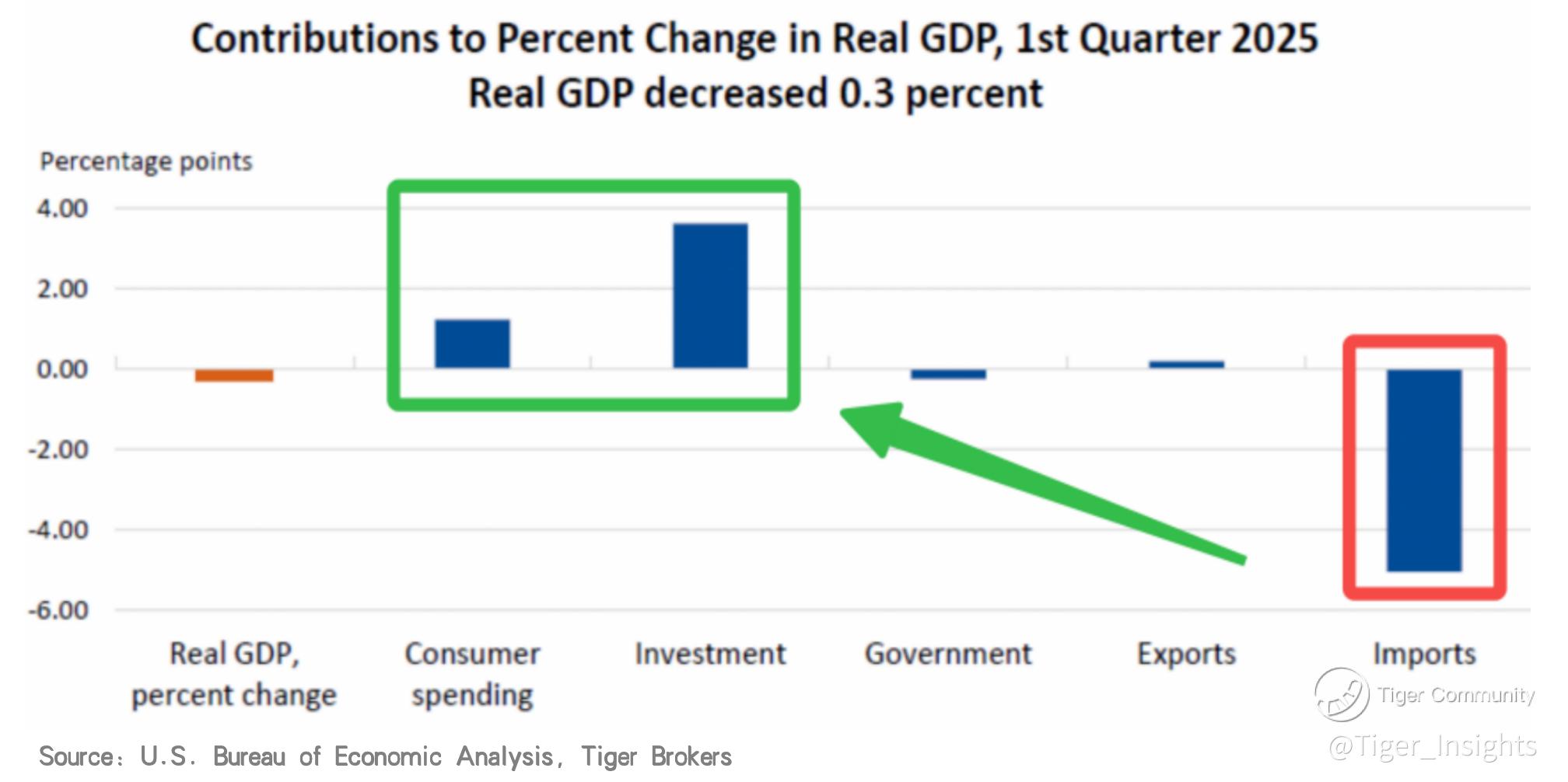 Moreover, investors soon identified the main culprit behind the GDP decline: a surge in import activity driven by tariff concerns. A breakdown of the data showed that net exports alone dragged GDP down by nearly 5%, more than the combined contributions of government spending and consumer consumption. According to CICC estimates, when stripping out the effects of net exports and inventory buildup, the real GDP growth for Q1 would be around 2.48%, nearly in line with the previous 2.4% reading. This revelation eased fears, as markets began to understand that the GDP data did not necessarily imply an imminent U.S. recession.