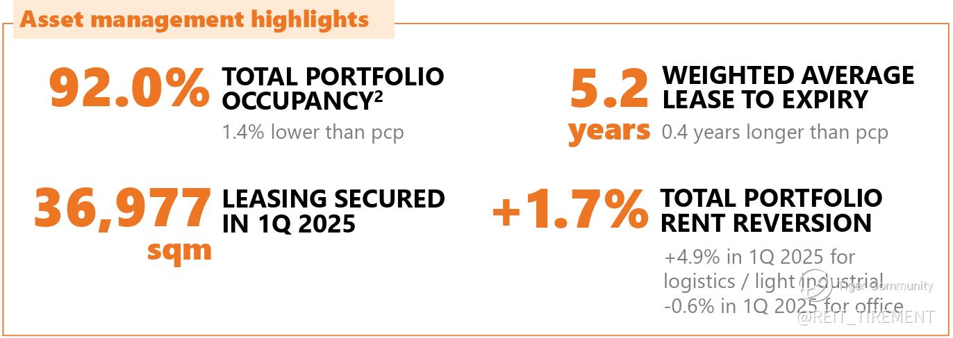 Portfolio rental reversion stood at +1.7% in the quarter. The logistics and light industrial segment saw a +4.9% uplift, while the office segment recorded a slight -0.6% reversion.