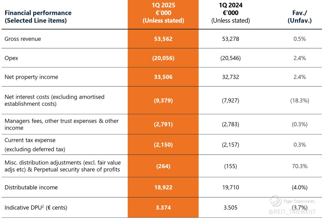 Compared to the previous quarter, operational performance has slightly improved, driven by a stronger NPI base. However, distribution to unitholders remained constrained due to elevated interest expenses. On the debt front, no refinancing is required until late 2026.
