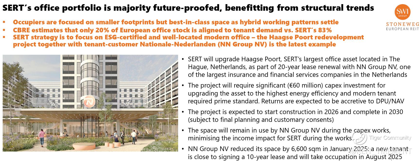 Two AEIs/developments are committed for Nove Mesto One Industrial Park 1 and Spennyoor, focusing on space expansion and solar panel installation. Additionally, De Ruijterkade 5 is in early planning stages. For Haagse Poort (Netherlands), a major €60 million upgrade has been confirmed and is expected to commence in 2026. Meanwhile, Maxima, Via Dell’Industria 18 and Kolumbusstraße 16 are under redevelopment.