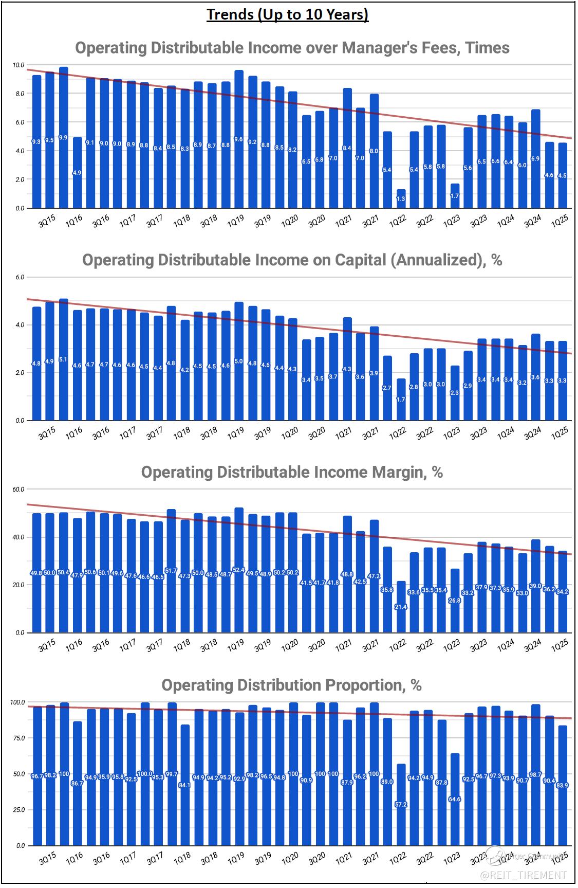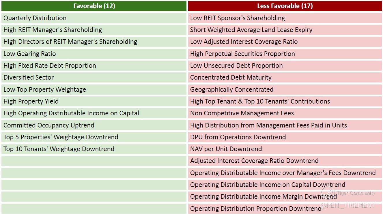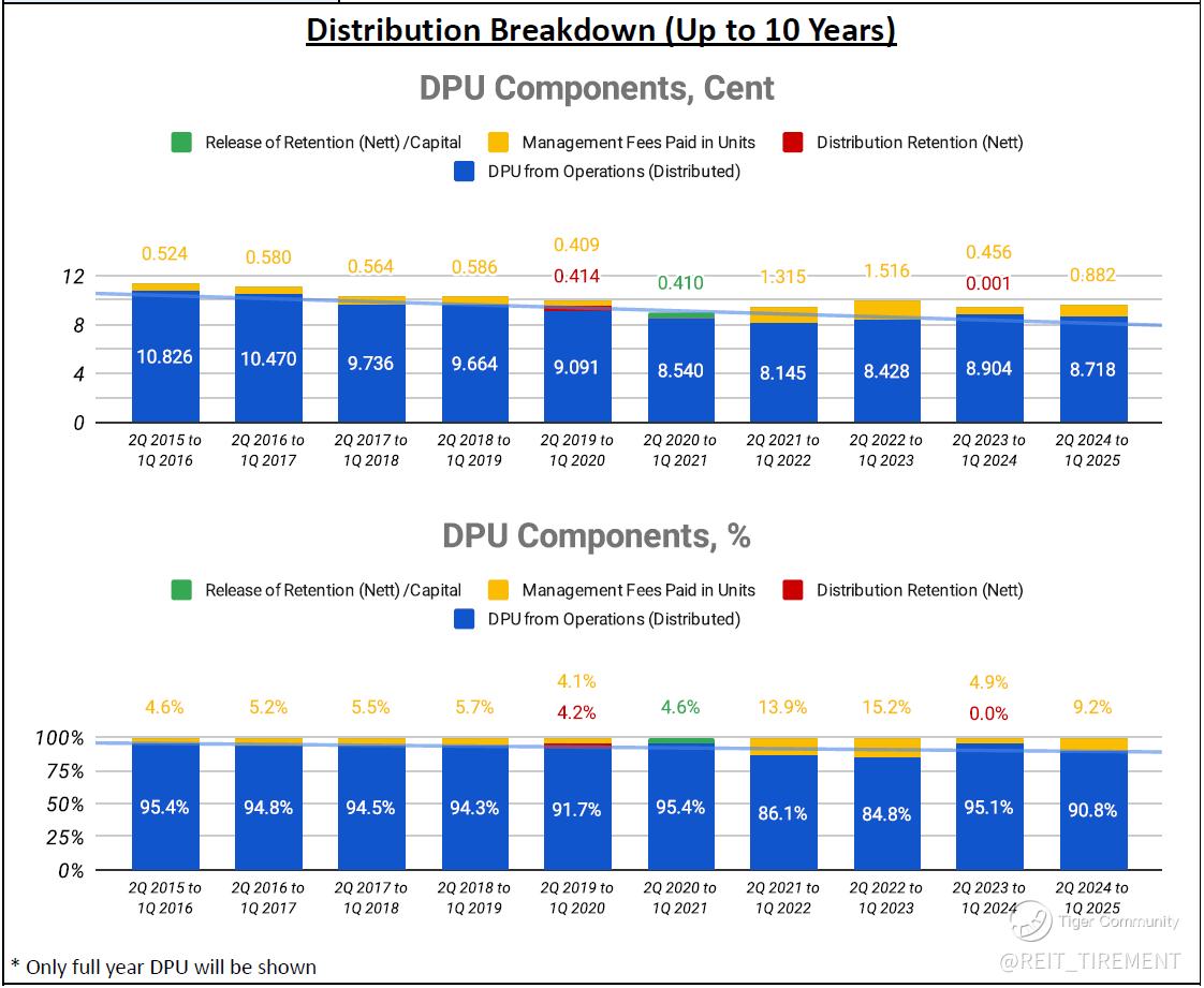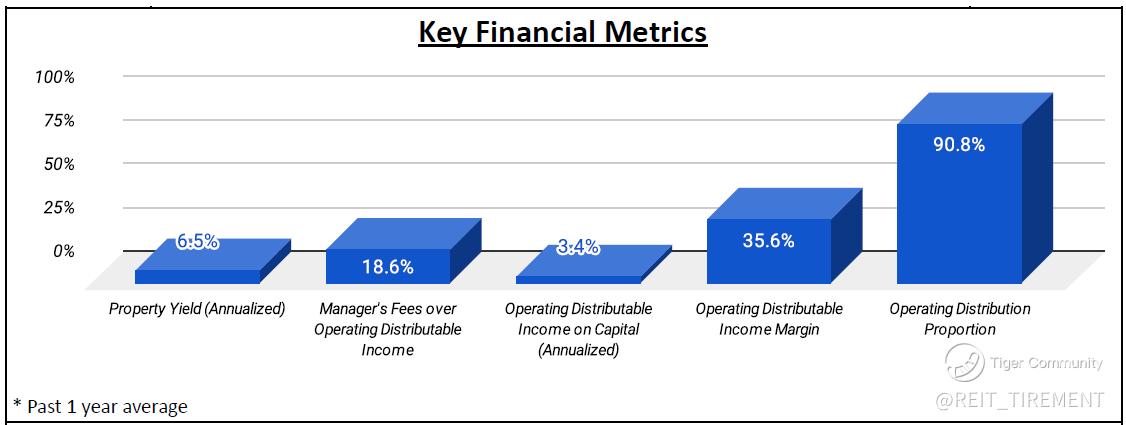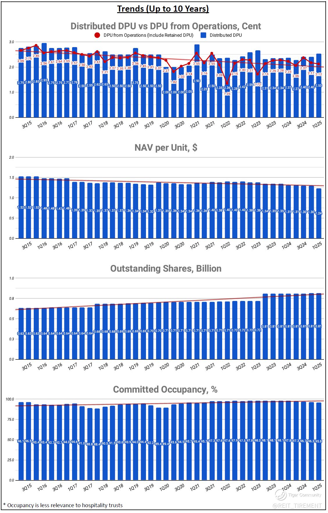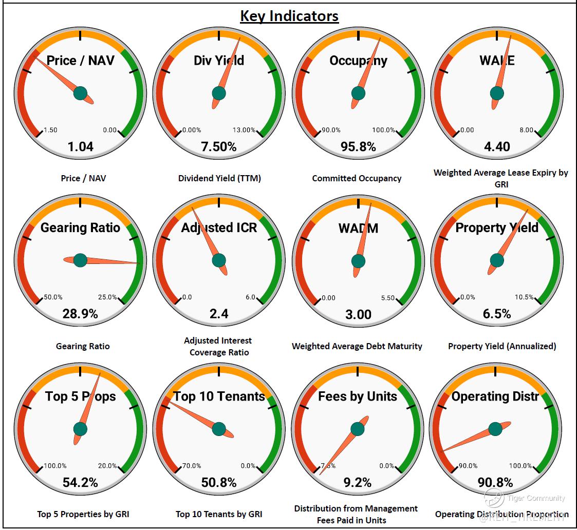 Downtrend: DPU from Operations, NAV per Unit, Adjusted Interest Coverage Ratio, Top 5 Properties' Weightage, Top 10 Tenants' Weightage, Operating Distributable Income over Manager's Fees, Operating Distributable Income on Capital, Operating Distributable Income Margin, Operating Distribution Proportion