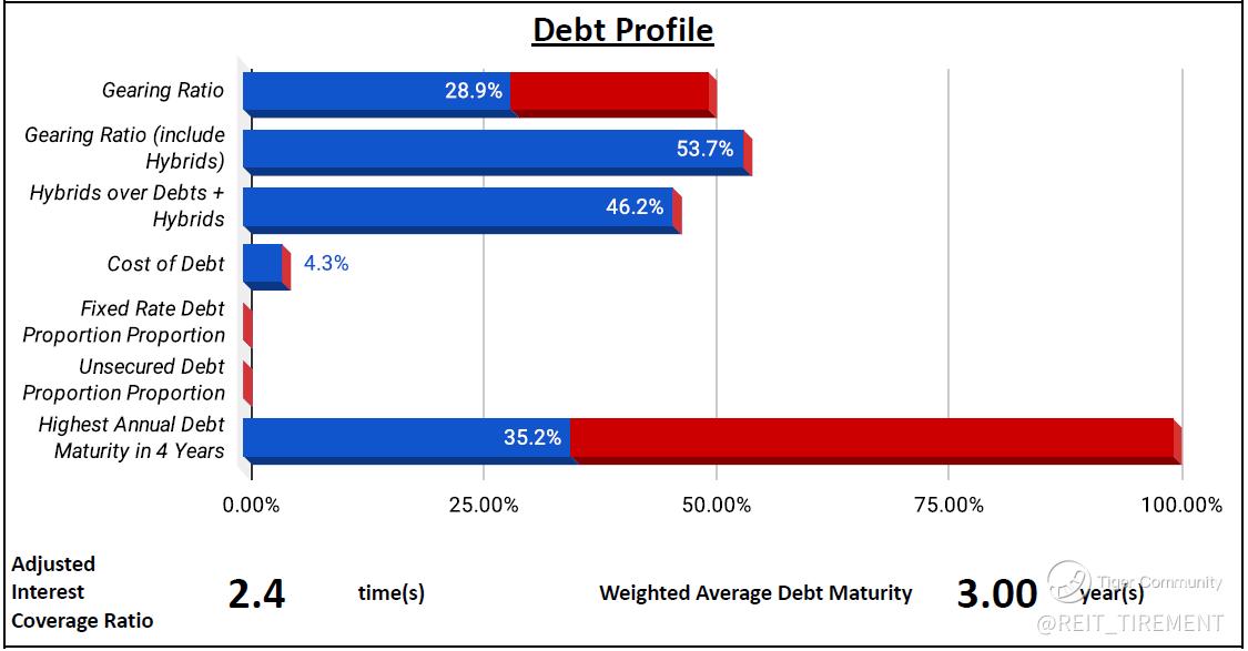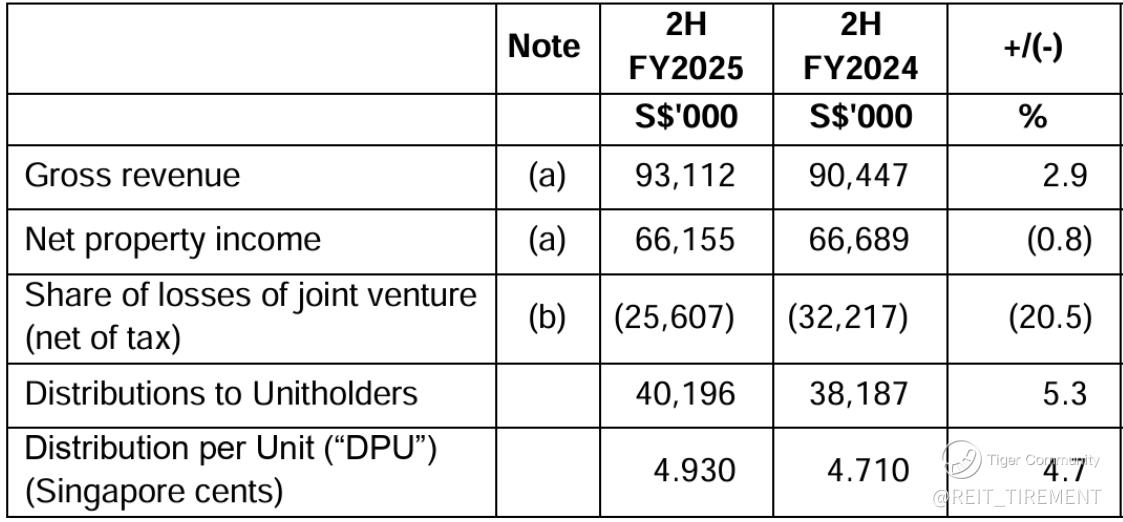 Compared to the previous half-year, gross revenue remained stable, although NPI experienced a minor decline due to increased property expenses. Nevertheless, DPU saw an improvement, largely attributed to lower borrowing costs and the release of retention held in the previous half year. On the debt front, there is no refinancing need in the coming fiscal year.