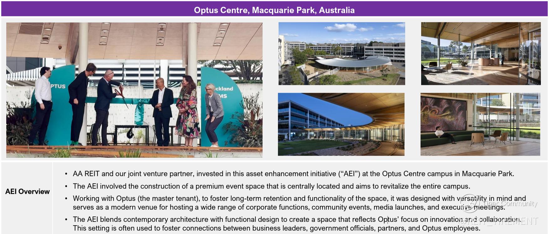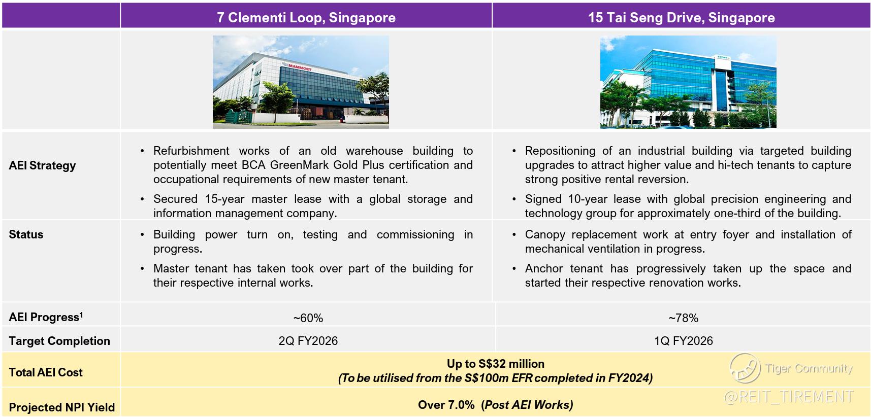 AAREIT currently has two ongoing AEIs in Singapore. The AEI at 15 Tai Seng Drive remains on track for completion in 1Q FY2026. However, the completion of 7 Clementi Loop has been delayed to 2Q FY2026. Additionally, an AEI has been announced for Optus Centre in Australia, which includes the construction of a premium event space.