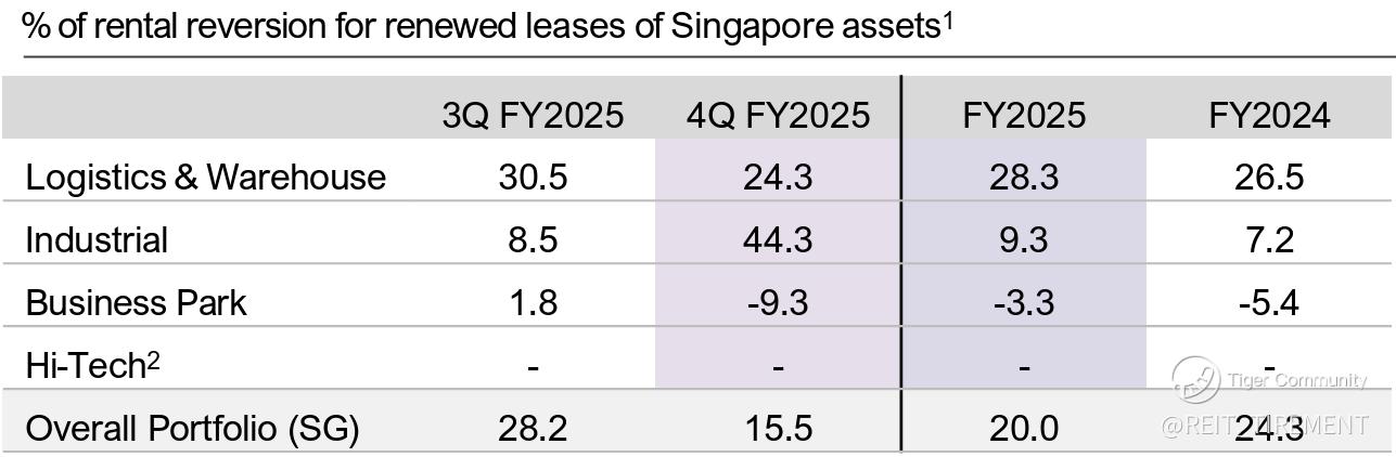 The REIT recorded strong rental reversion for its Singapore assets, with 3Q and 4Q FY2025 achieving 28.2% and 15.5% respectively. For the full year, the rental reversion stood at a robust 20%.