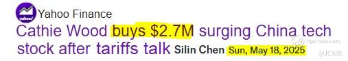 Interestingly, on 18 May 2025 it was reported that $ARK Innovation ETF(ARKK)$ investment officer Cathie Wood has just spent $2.7 million to buy 30,217 shares of Chinese stock BIDU. (see above)