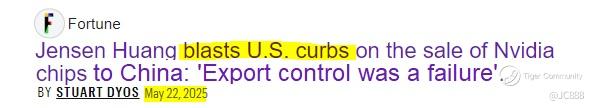 Could this be the reason why Jensen Huang criticized US export controls blocking the sale of its AI chips to China and calling the export curbs a “failure” during a tech forum in Taipei on Wed, 21 May 2025 ?