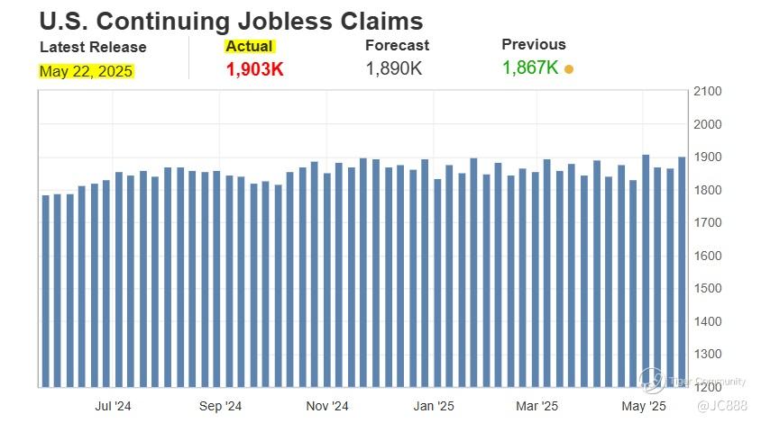 Continuing jobless claims (number of people still receiving unemployment benefits) rose by +36,000 to 1.903 million for week ending 10 May 2025.