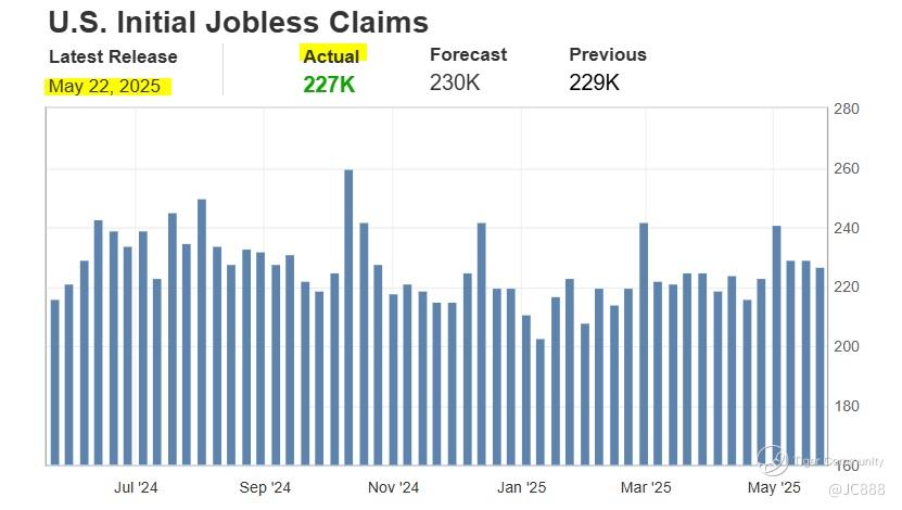 Initial jobless claims for the week ending 17 May 2025, fell by -2,000 to 227,000, marking a 4-week low and coming in slightly better than forecasts.