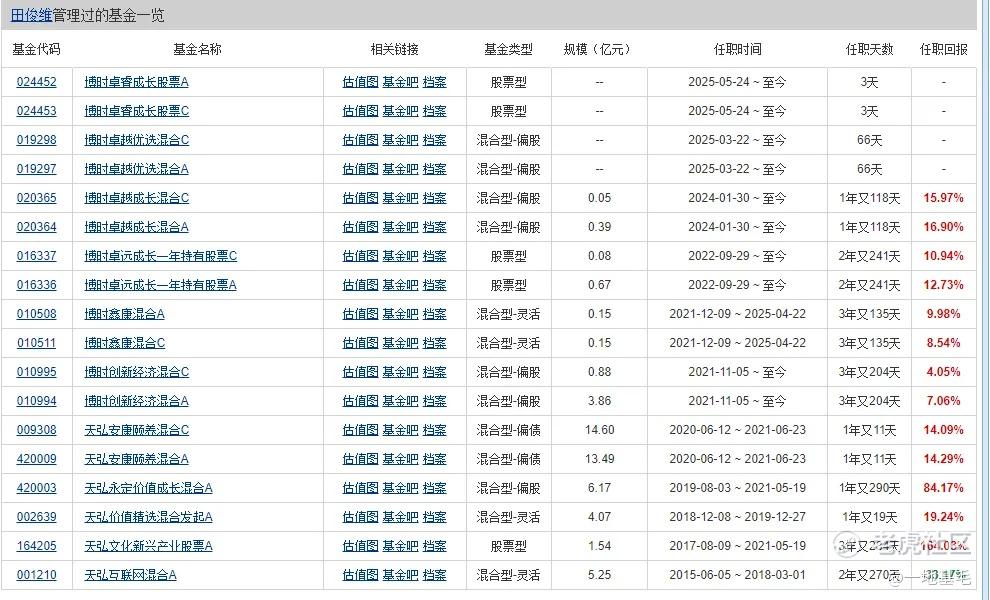 田俊維的投資生涯主要分爲兩個階段。在天弘基金任職期間(2015 年 6 月 5 日 - 2021 年 6 月 23 日),其管理的基金業績表現差異較大。