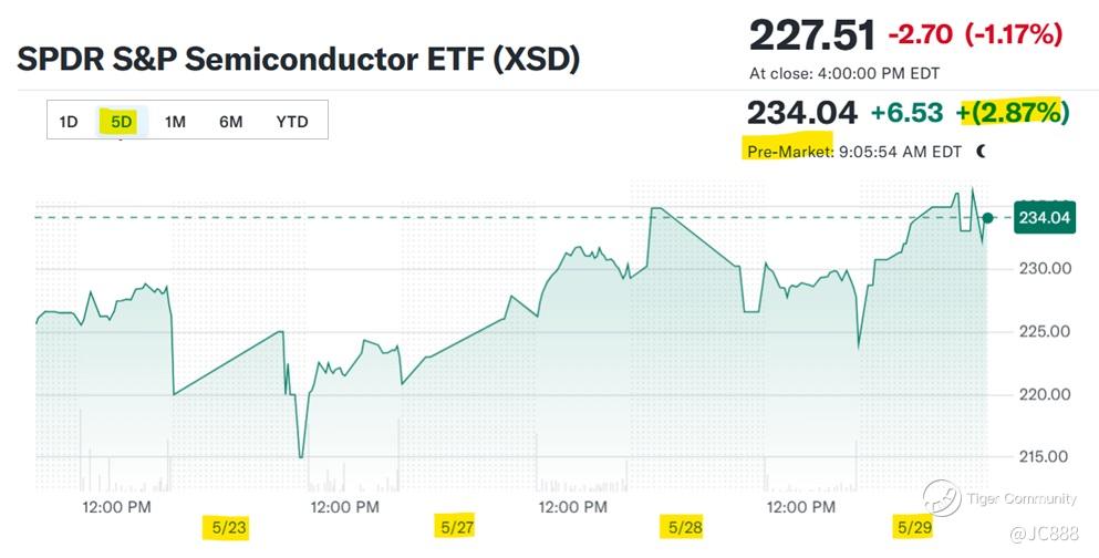 Pre-market readings for Thu, 29 May 2025, showed a strong rebound, with XSD indicated up over +4% following Nvidia’s upbeat earnings and positive sentiment across semiconductor stocks. (see below)