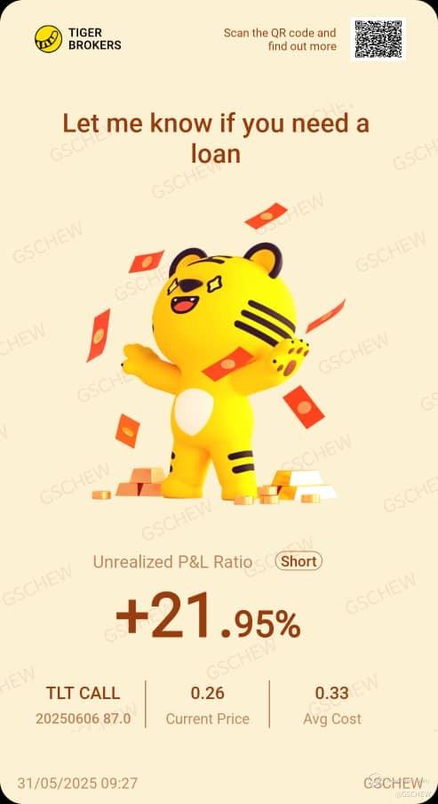 2. TLT current price as at 31 May 2025 at USD 86 (approximately 3.2%) away from the 52 weeks low at USD 83.30.