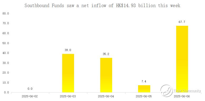 Southbound funds (mainland investment into Hong Kong stocks) saw a net inflow of HK$14.9 billion this week.