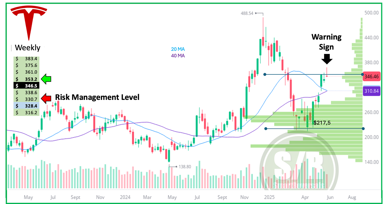 $Tesla Motors(TSLA)$ Last week, the Weekly Compass presented the following chart in the premium section for paid subscribers. The shooting star served as a warning sign, finding resistance at a key level detailed in the publication. When such reversal signals caution against long positions, it becomes essential to establish a clear "line in the sand" using support and resistance levels.