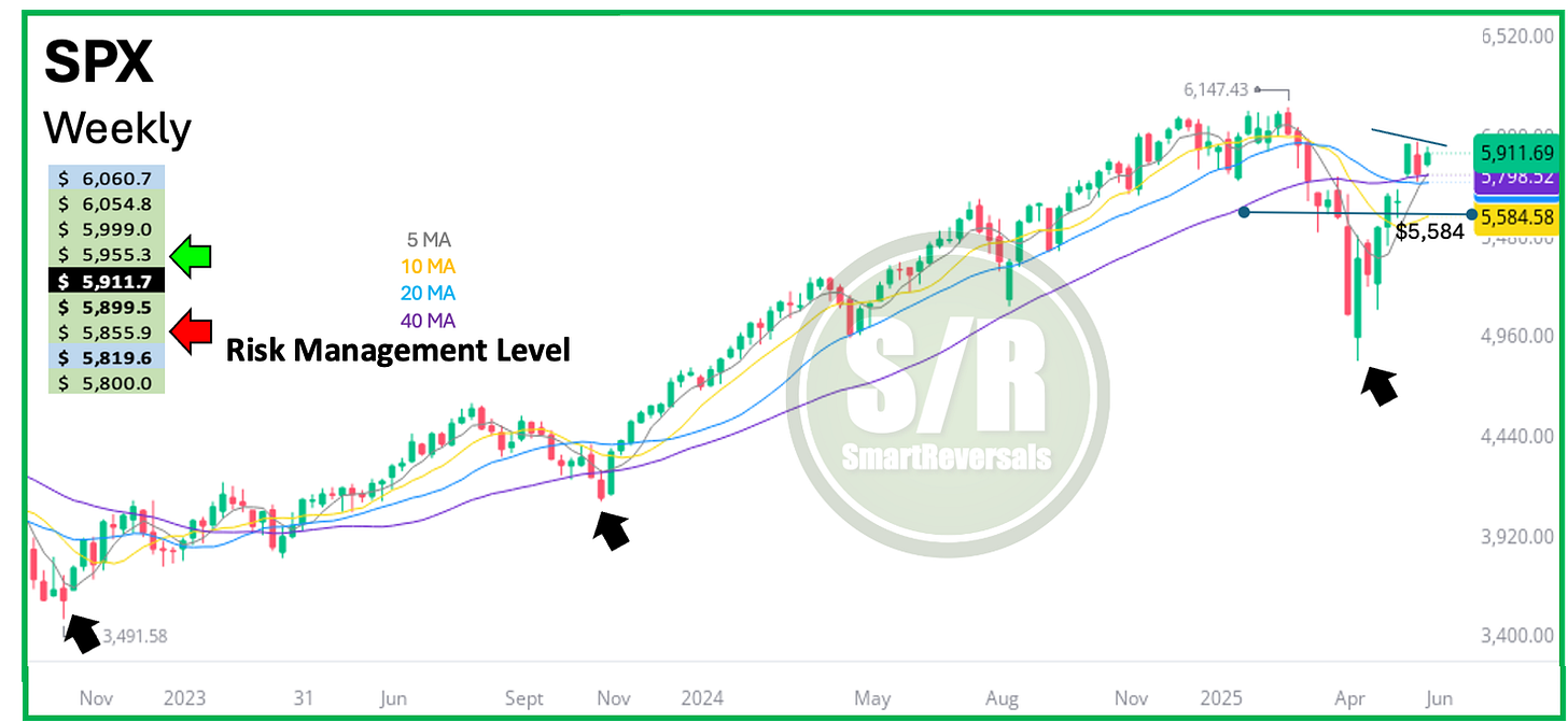 $S&P 500(.SPX)$ was analyzed with the following chart (and other indicators), setting some risk for the very short term, and $5,899.5 as the reference to manage risk for longs. This is a good example for traders.