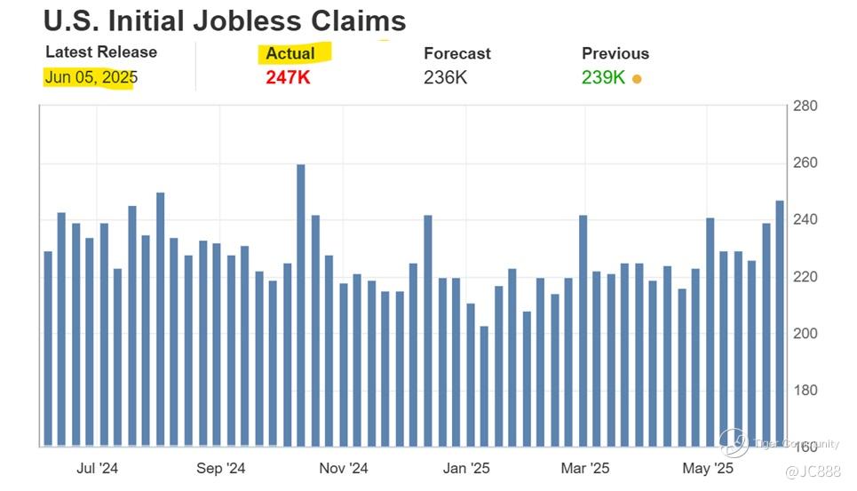 On Thu, 05 Jun 2025, the number of Americans filing new applications for unemployment benefits increased to a 7th-month high for week ending 31 May 2025.