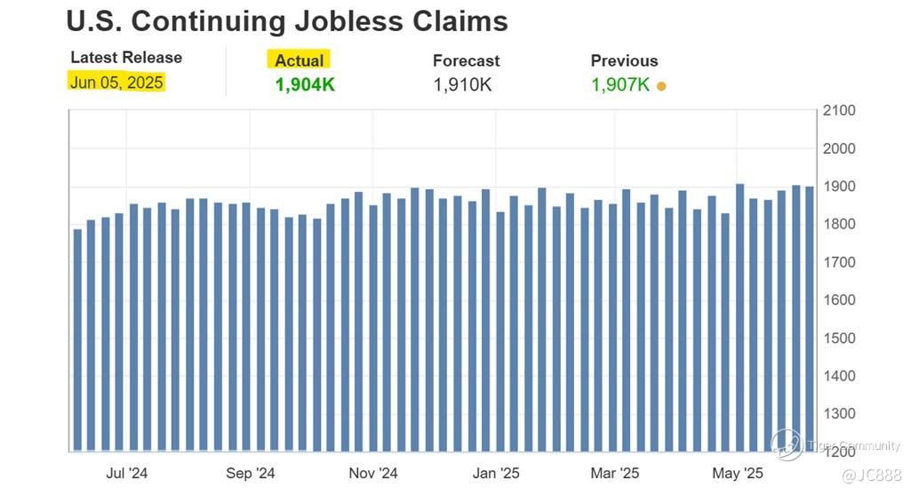 For week ending 24 May 2025, number of people who continue to receive jobless claims has slipped -3,000 to a seasonally adjusted 1.904 million. (see above)