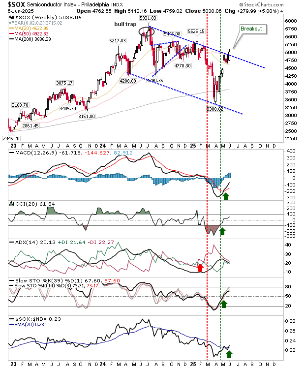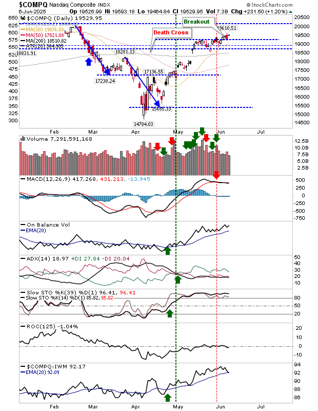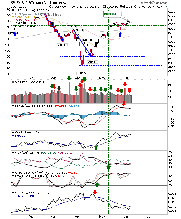 The S&P joined the Nasdaq with its late week breakout and is on course to challenge the 'bull trap' at 6,100. And, as with the Nasdaq, it awaits a new 'buy' signal in the MACD.