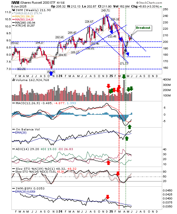 It was the same for the Russell 2000 ($IWM) as it cleared its downward (weekly) channel. The breakout was backed by volume accumulation, although technicals remain 50:50 between bulls and bears.