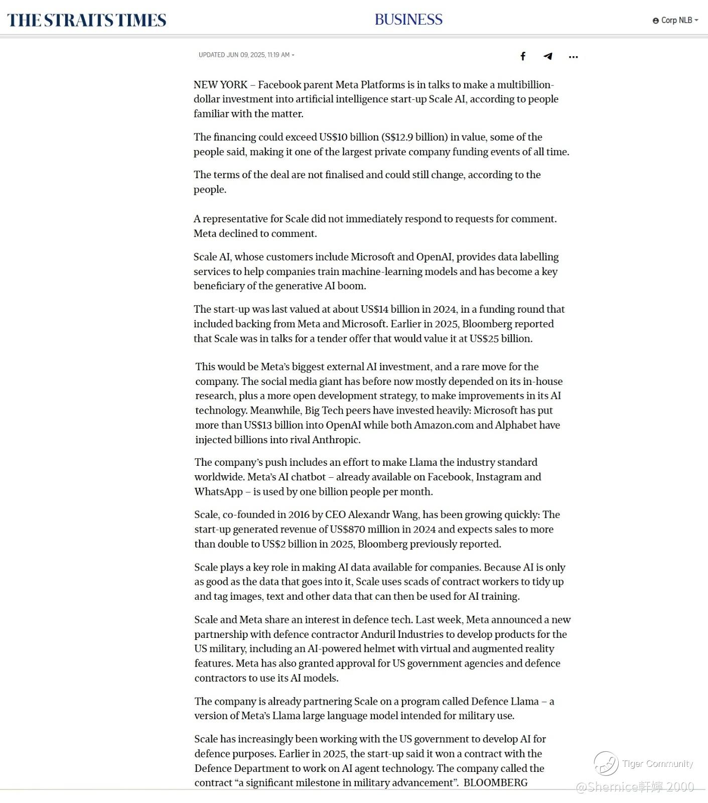 Meta Platforms is reportedly negotiating a landmark investment exceeding $10 billion in Scale AI, a leading data-labeling startup valued at $14 billion in 2024 and potentially $25 billion in a 2025 tender offer. Scale AI provides data labeling services critical for training machine-learning models, serving clients like Microsoft and OpenAI. This potential deal, if finalized, would be one of the largest private funding events, reflecting the soaring demand for high-quality AI training data amid the generative AI boom. Meta’s move aims to bolster its AI infrastructure to compete with Microsoft, Amazon, and Alphabet, though terms remain fluid.