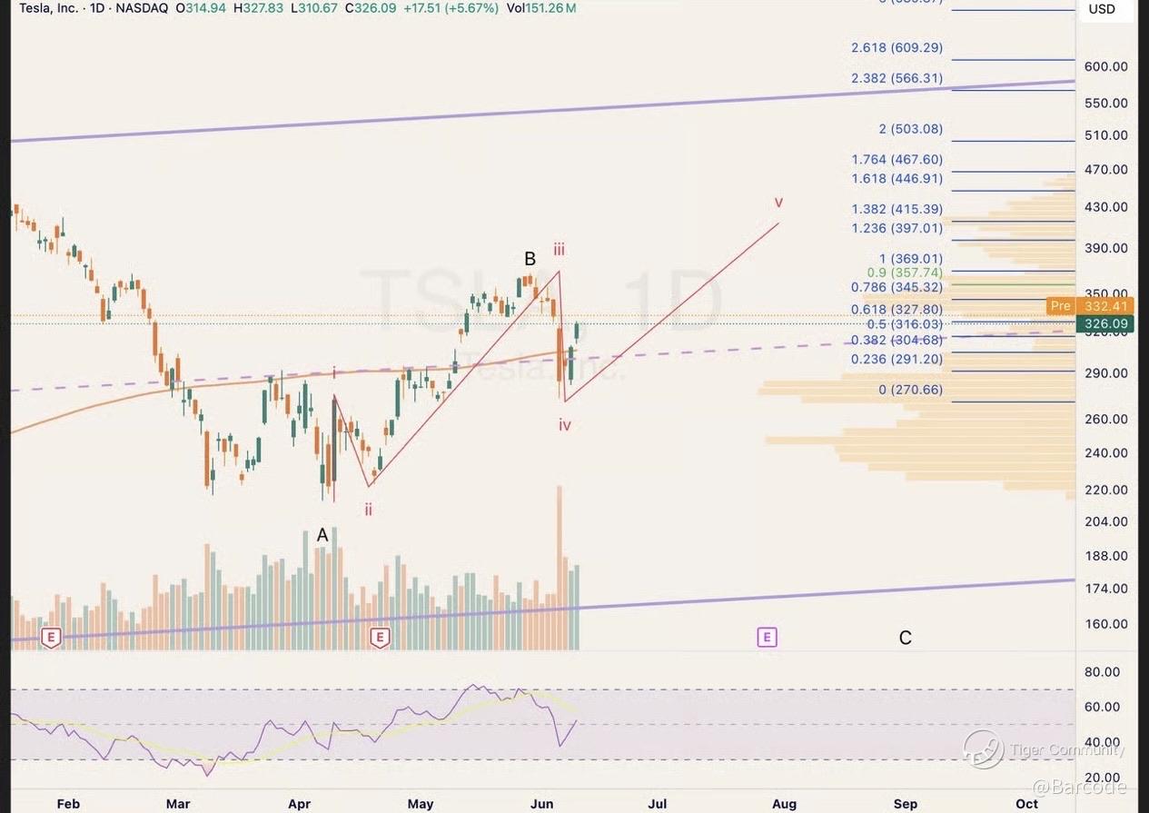 Tesla’s price action is painting a picture of resilience. After last week’s dip, sparked by Musk’s now-retracted clash with Trump, the stock rebounded sharply from the 0.618 Fibonacci retracement at $327.80. As of today, it’s hovering near $332.94, testing the weekly 30-period moving average at $335.16, a level that’s historically acted as a springboard or ceiling. The volume profile reveals persistent buying between $291 and $335, suggesting a sturdy accumulation zone.