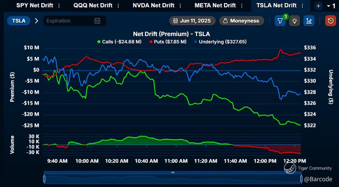 We’re currently in a gamma-neutral zone, but if price breaches $350 with volume, dealer adjustments could amplify the move into a self-reinforcing rally. The confluence of the 0.618 Fibonacci retracement and gamma flip zone around $327 to $335 increases the probability of a breakout rally if $350 clears. This isn’t retail speculation, this is calculated institutional positioning.