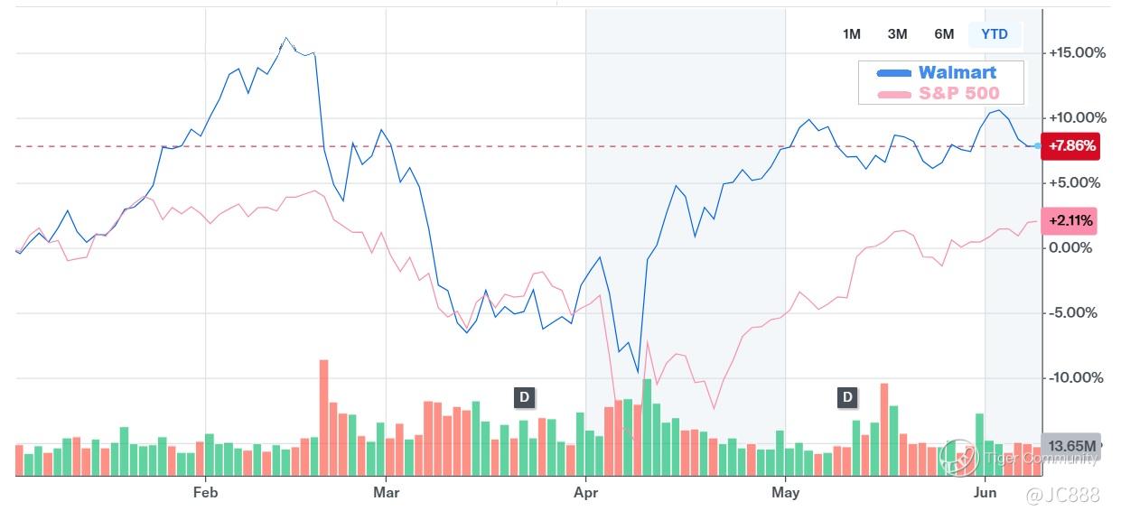 2025 YTD Performance: despite market volatility and economic contraction in Q1 2025, Walmart’s stock has remained resilient, outperforming the S&P 500. (see below)