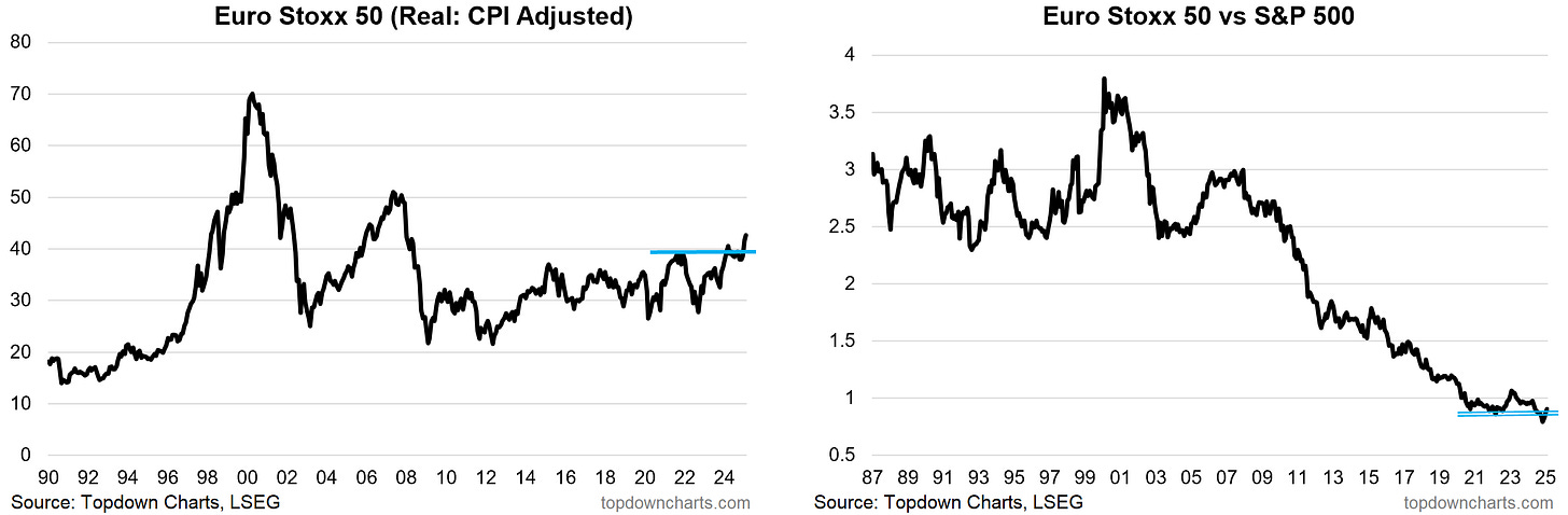 In CPI adjusted terms the EURO STOXX 50 looks less impressive, albeit arguably also looks better in terms of potential upside as there remains a large distance to the historical all-time inflation-adjusted highs. The breakout in real terms also looks very compelling.