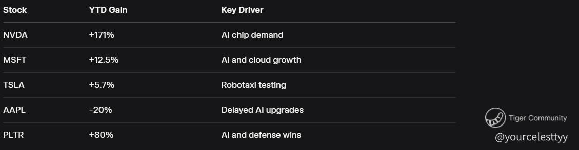 Palantir (PLTR): This AI and defense play is up 80% this year, fueled by government contracts and private-sector wins. Its stock has been a standout, proving that AI’s reach extends beyond consumer tech.