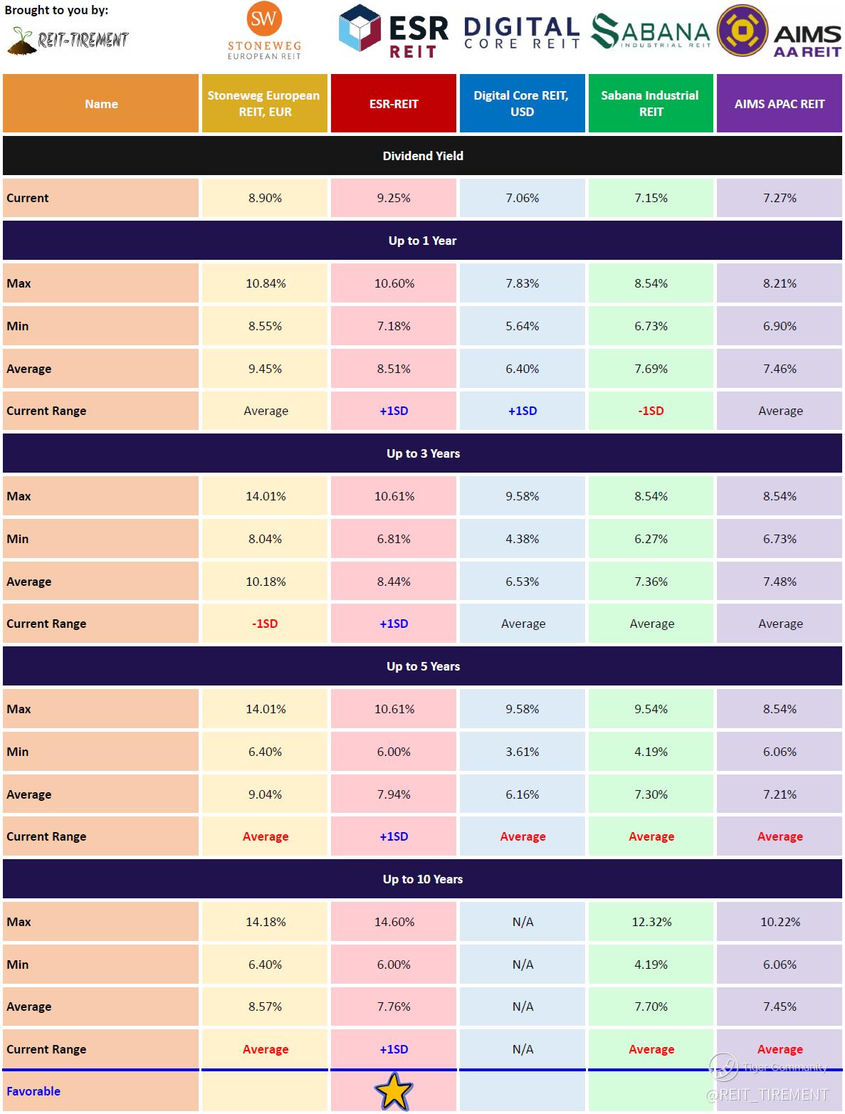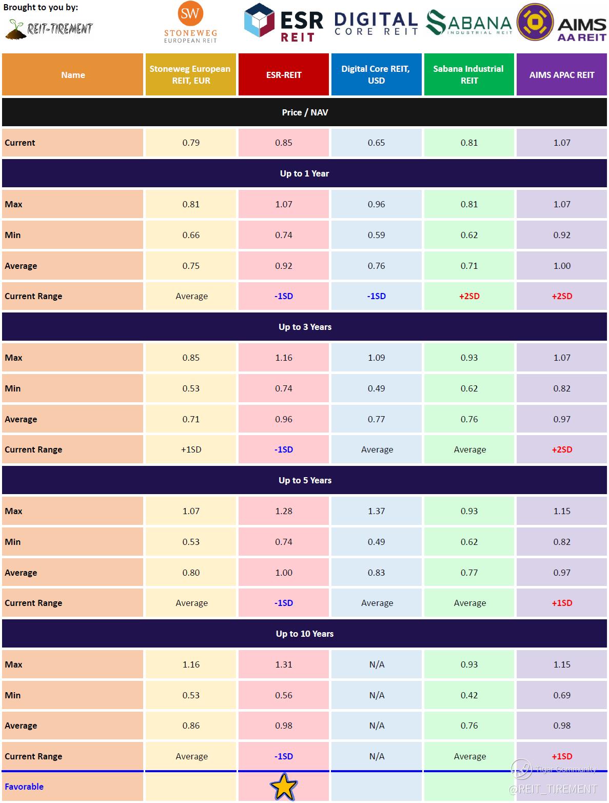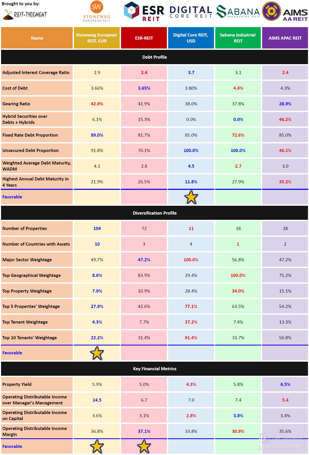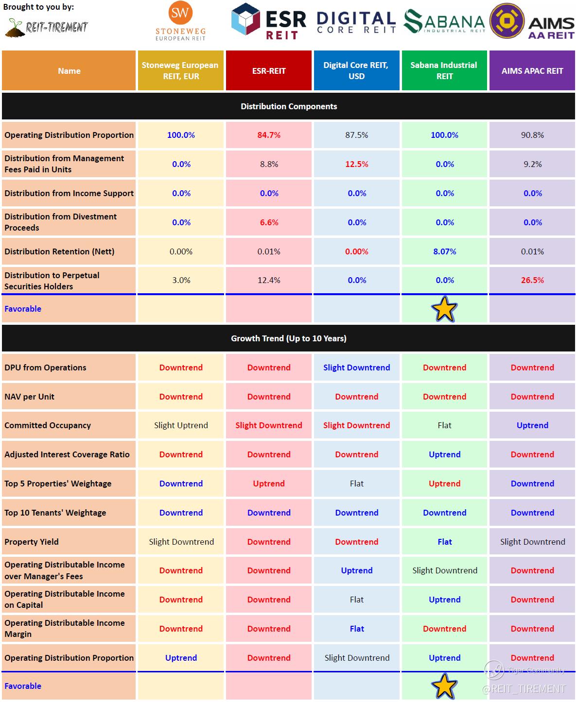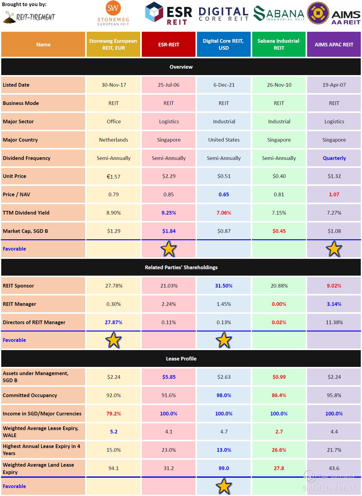 $AIMS APAC Reit(O5RU.SI)$ $ESR REIT(9A4U.SI)$ $Sabana Reit(M1GU.SI)$ $DigiCore Reit USD(DCRU.SI)$ $Stoneweg Reit EUR(CWBU.SI)$