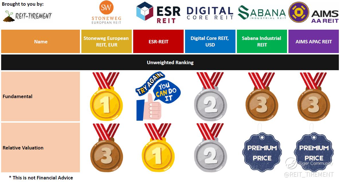 The above is just a quick comparison without weightage assigned. For more information, check out REIT-TIREMENT