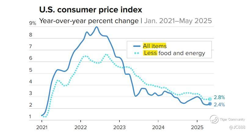 The Consumer Price Index (CPI) for May rose just 0.1% MoM, bringing the annual inflation rate to 2.4%, slightly below forecasts and suggesting that tariffs had not yet meaningfully impacted consumer prices. (see above)