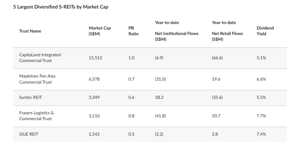 The larger diversified S-REITs in the Singapore market include $Straits Times Index(STI.SI)$ counters such as $CapLand IntCom T(C38U.SI)$ (CICT), $Mapletree PanAsia Com Tr(N2IU.SI)$ (MPACT), $Frasers L&C Tr(BUOU.SI)$ (FLCT), as well as $Suntec Reit(T82U.SI)$ , which is currently on the STI Reserve list.