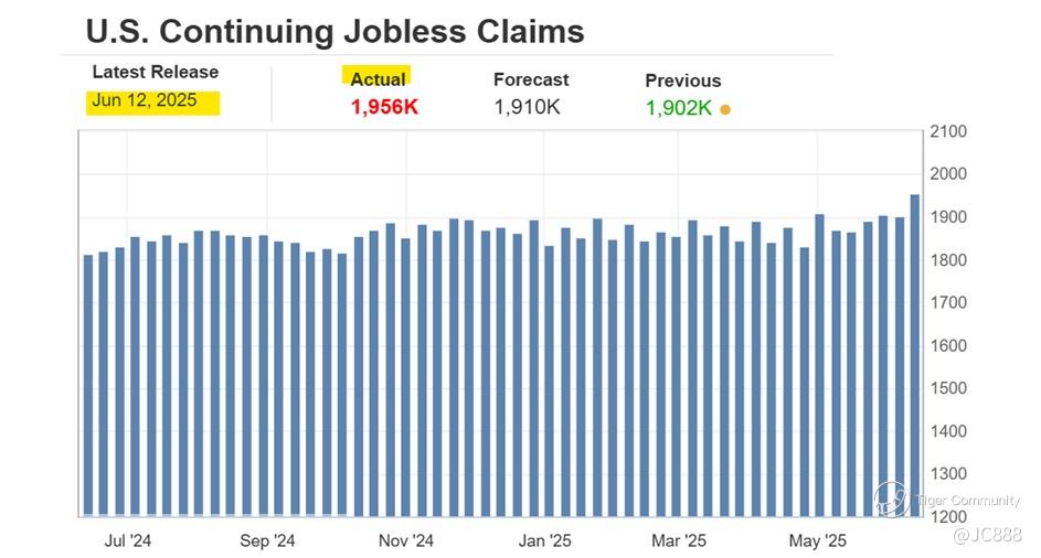 For week ending 31 May 2025, continuing claims increased by 54,000 to a seasonally adjusted 1.956 million, the highest level since 13 Nov.