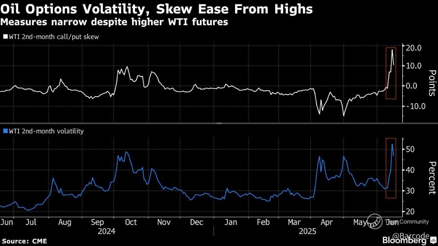 • Oil options skew and vol are easing, but poised to spike on hard news