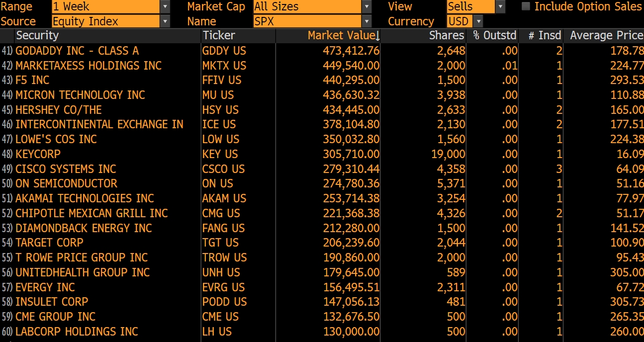 The remaining 10 of the top 20 insider stock sales are: $Meta Platforms, Inc.(META)$ , $Fair Isaac(FICO)$ , $Kellanova(K)$ , $L3Harris Technologies, Inc.(LHX)$ , $Seagate Technology PLC(STX)$ , $Tyler(TYL)$ , $Coinbase Global, Inc.(COIN)$ , $Northrop Grumman(NOC)$ , $MasterCard(MA)$ , $Visa(V)$