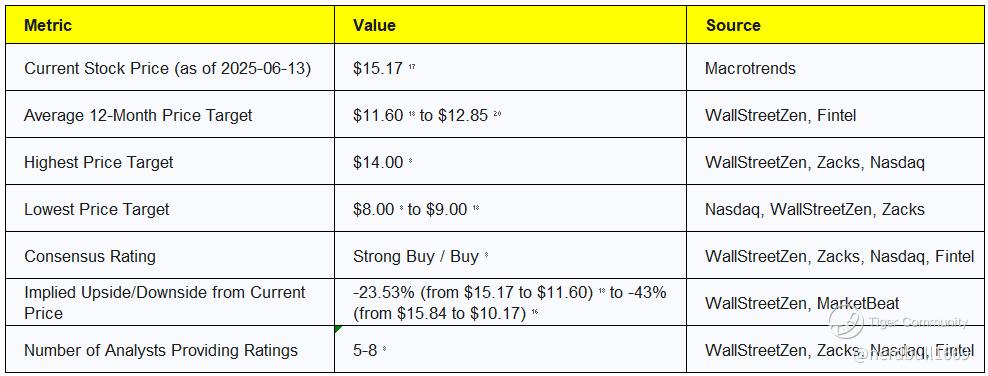 Analyst consensus from a pool of 5-8 analysts is overwhelmingly positive, with a "Strong Buy" or "Buy" recommendation. However, a significant discrepancy exists between these positive ratings and the actual 12-month price targets provided by the same analysts. The average price targets range from $10.62 to $12.85.