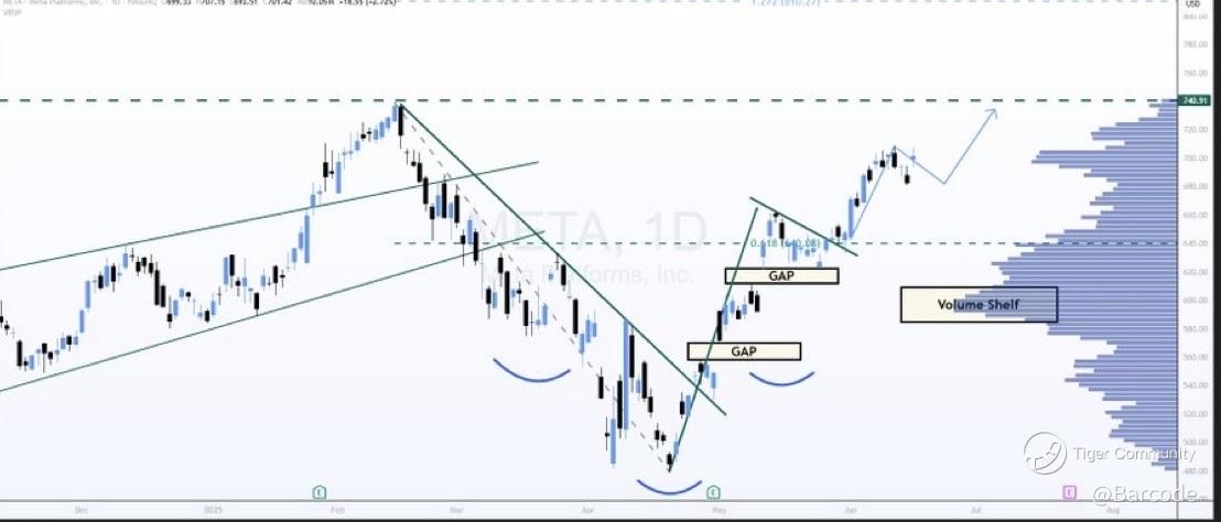 Meta is riding strong momentum off a confirmed bull flag breakout. Price is now consolidating just under resistance at $707. If it clears, $740 is in range with a Fib extension target at $810.