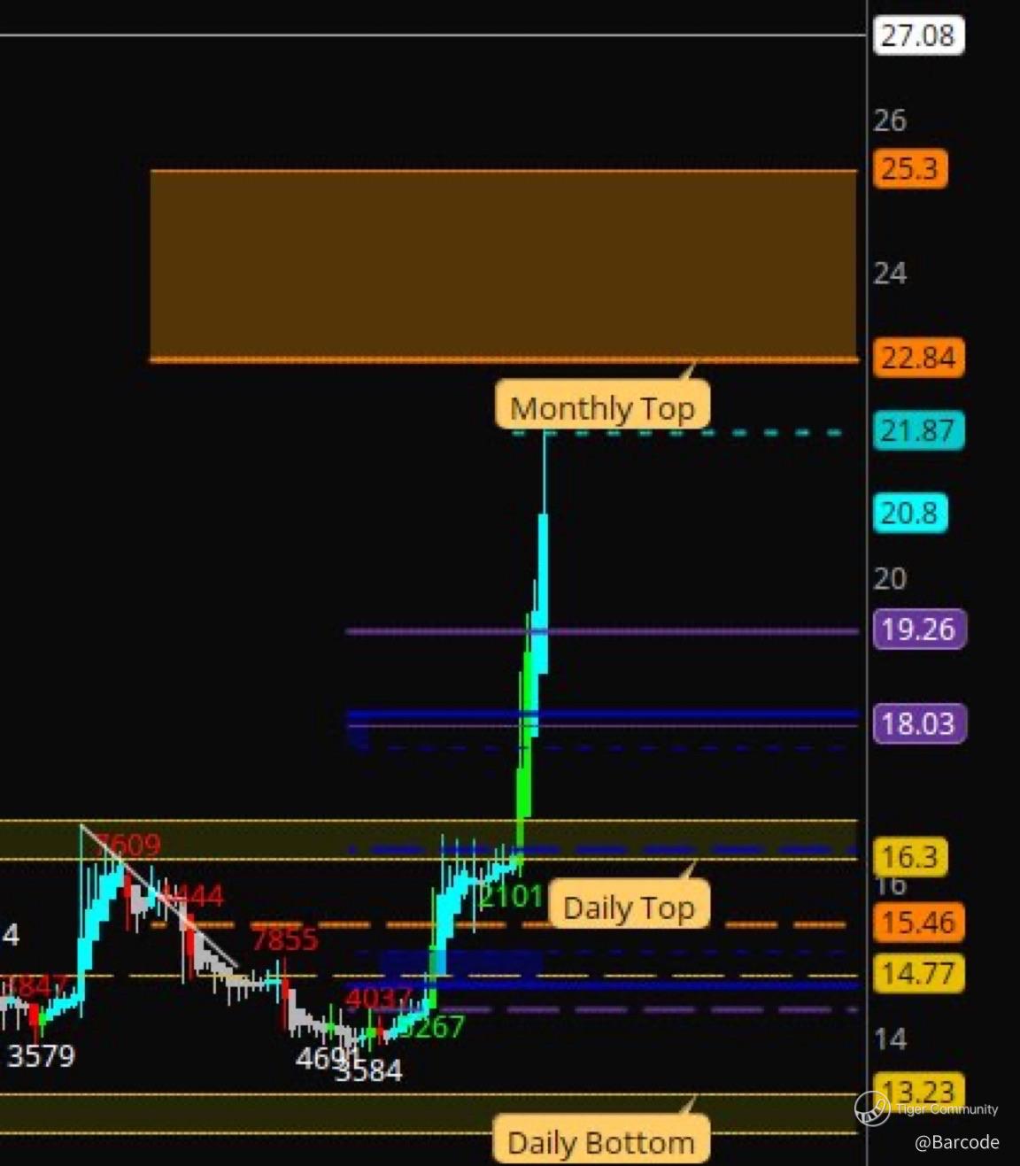 We’ve already printed $21.93 overnight. That puts us inches from the 1.414 level, and just beneath a critical monthly top at $22.84. If bulls can reclaim and hold that zone, this move could unlock a full Fibonacci stretch.