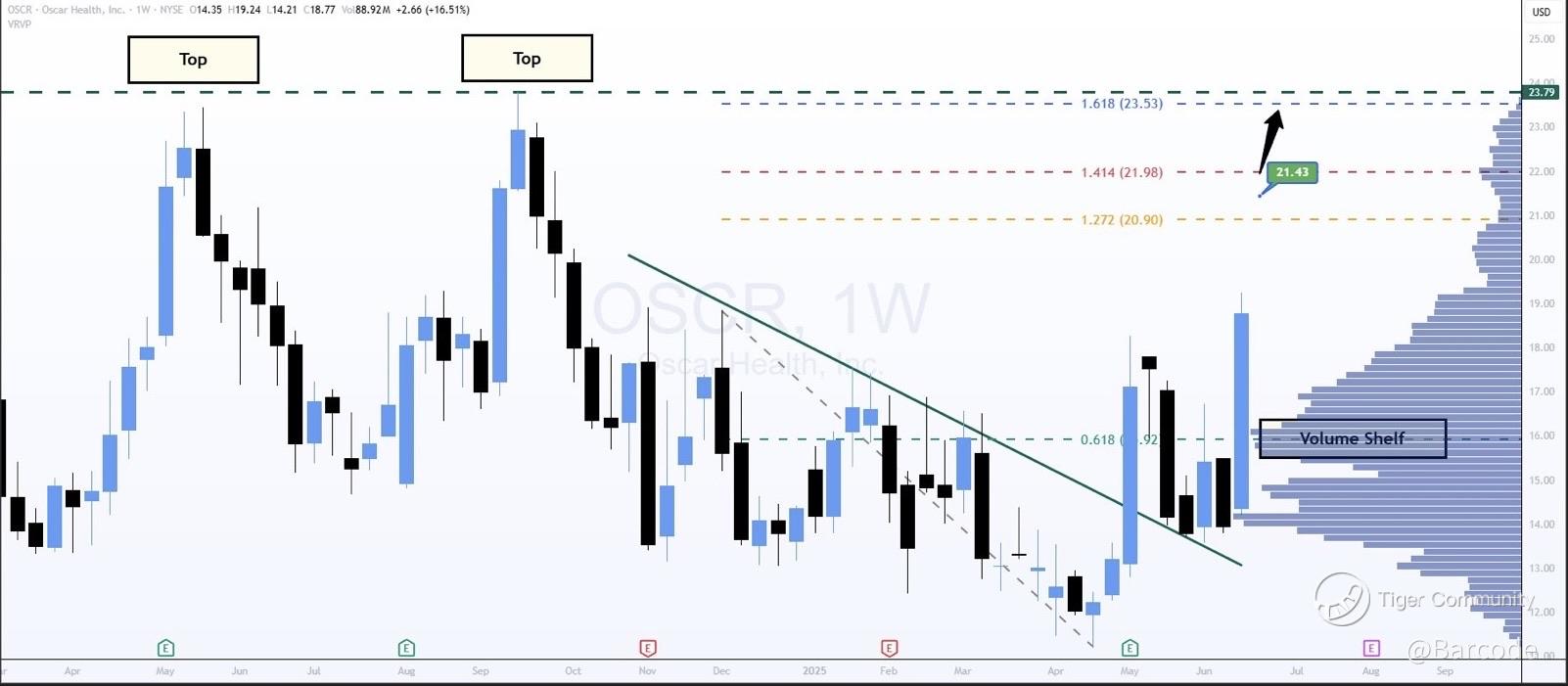 Last week, $OSCR cleared the 0.618 retracement at $15.92 and burst through a volume shelf that had been capping price for months. Volume surged to 88.92M on June 19. Now, the stock’s slicing through clean air with targets in view: