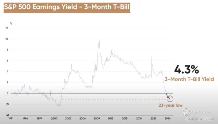 To appreciate why Buffett might prefer short-term Treasuries to equities, consider the earnings yield of the S&P 500—which currently sits at a historic low near 3.8%. Subtracting the 4.3% yield of a 3-month Treasury bill, the spread is now negative.