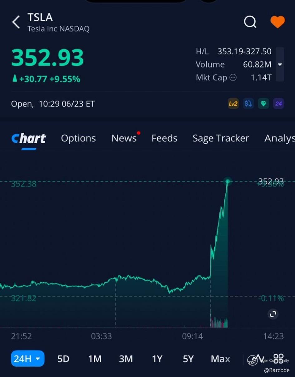 This wasn’t a publicity stunt. This was Tesla becoming the first automaker in the world to monetise a true autonomous ride-hailing service. And the market responded in kind. $TSLA surged +9.3% intraday to $352.93, backed by a thunderous 60.8M volume spike, crushing its 45M daily average.