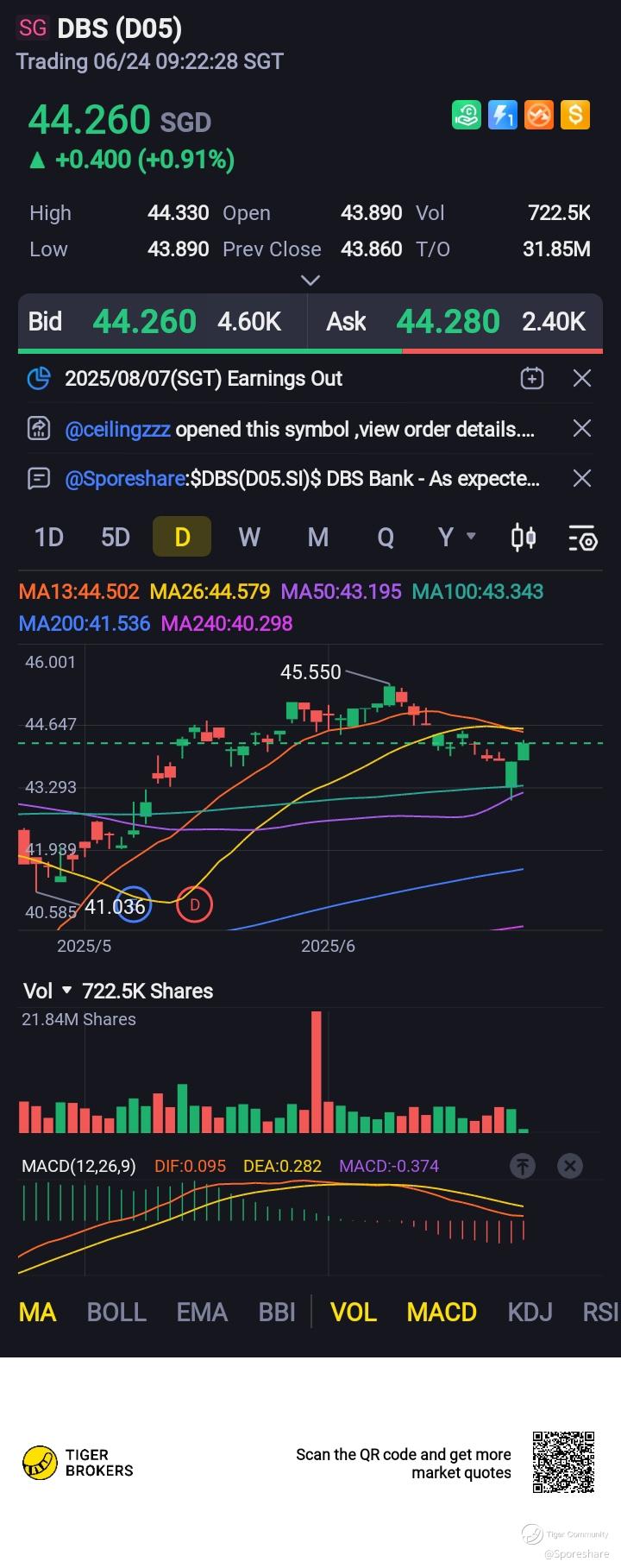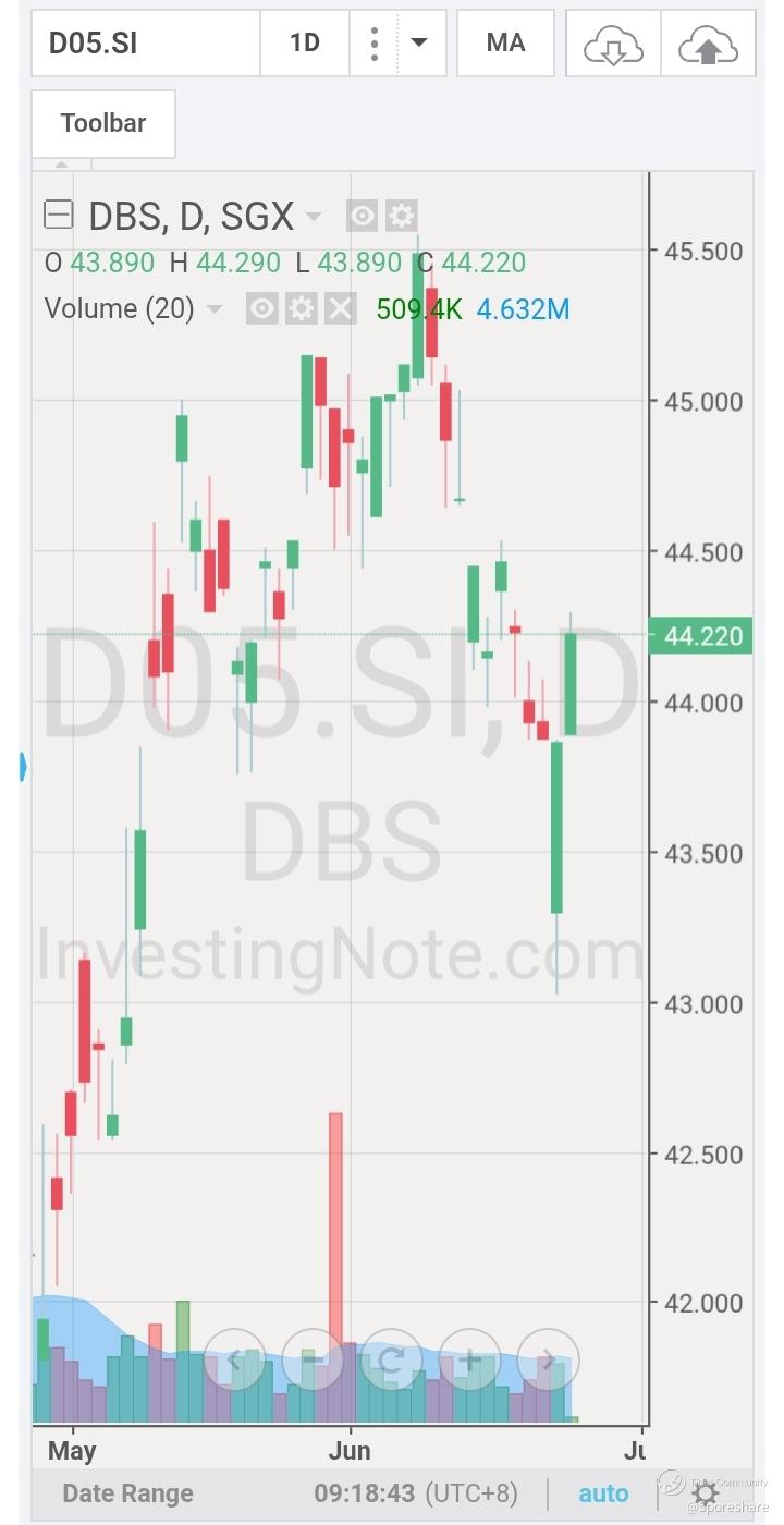 DBS Bank - As expected, price is down due to war but I think the dividend may likley support the price at current price of 43.40 with an yield of 6.91 percent!
