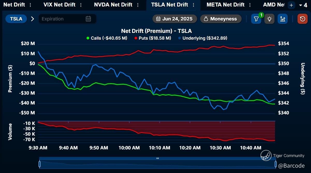 Yesterday saw over $130M in net single-leg call buying, aggressive, short-dated, and directional. Today, things cooled: $40M in calls sold, $19M in puts picked up. This is standard rotation after explosive action. Tesla’s options volume remains on top of the board with 3.51M contracts traded, and spot volume surged again to 51.15M shares. This isn’t panic, it’s pacing.