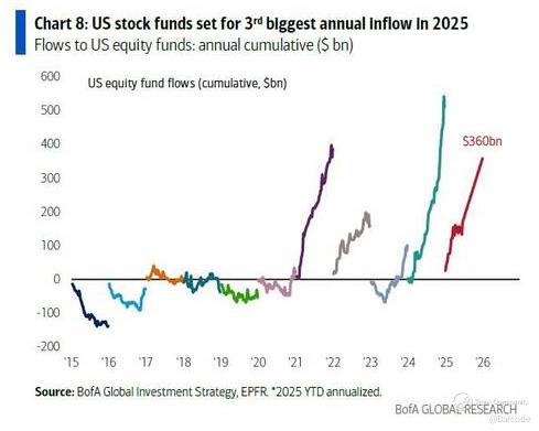 Bank of America reports that US equity funds are tracking toward $360 billion in inflows this year, the third-largest annual total in history. Risk-on capital rotation is real, and Tesla, as a high-beta AI-adjacent growth name, is soaking it up. The Fed has paused, the VIX is calm under 20, and inflation is down near 2.5%. Liquidity is flowing back to innovation, not defence.